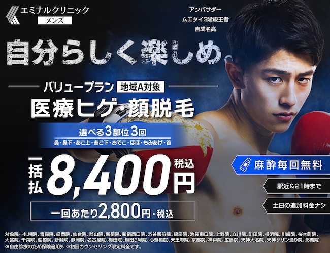 ヒゲ・顔脱毛 選べる3部位3回 一括払8,400円(税込)でコスパ◎
